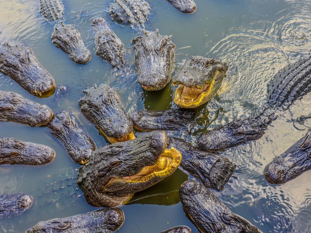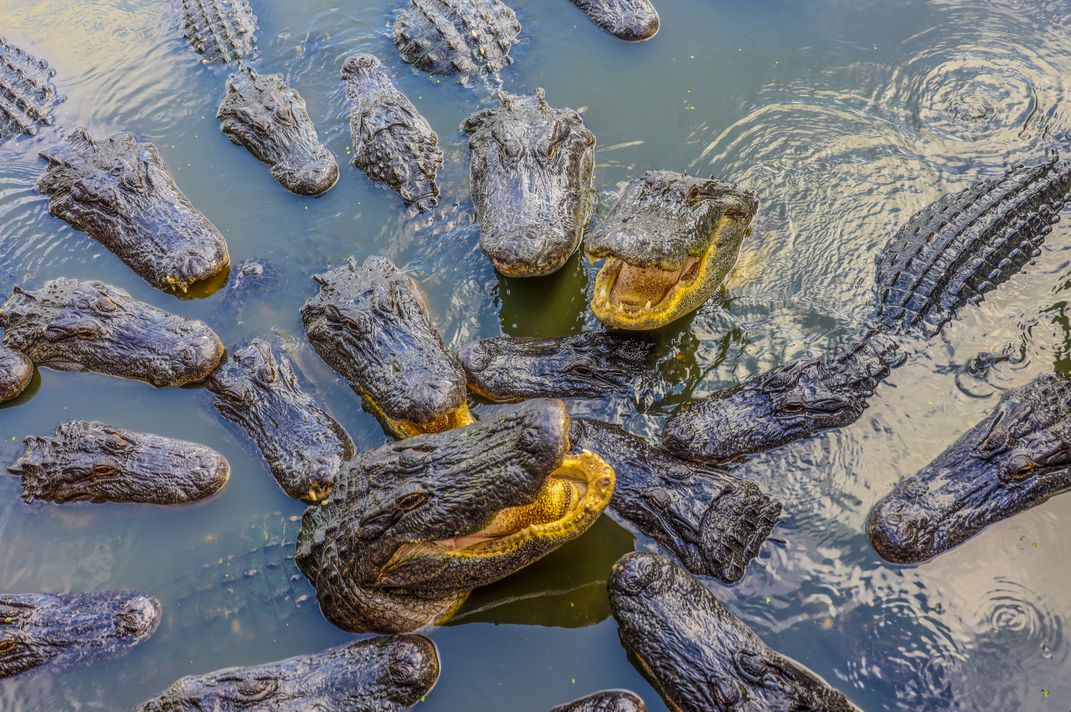 The two alligators get excited talking about their stories. It's funny how one of the entourage seems interested, while the rest of the guests remain expressionless. Even though it's not feeding time, everyone gathers around the two alligators, creating a hilarious scene.