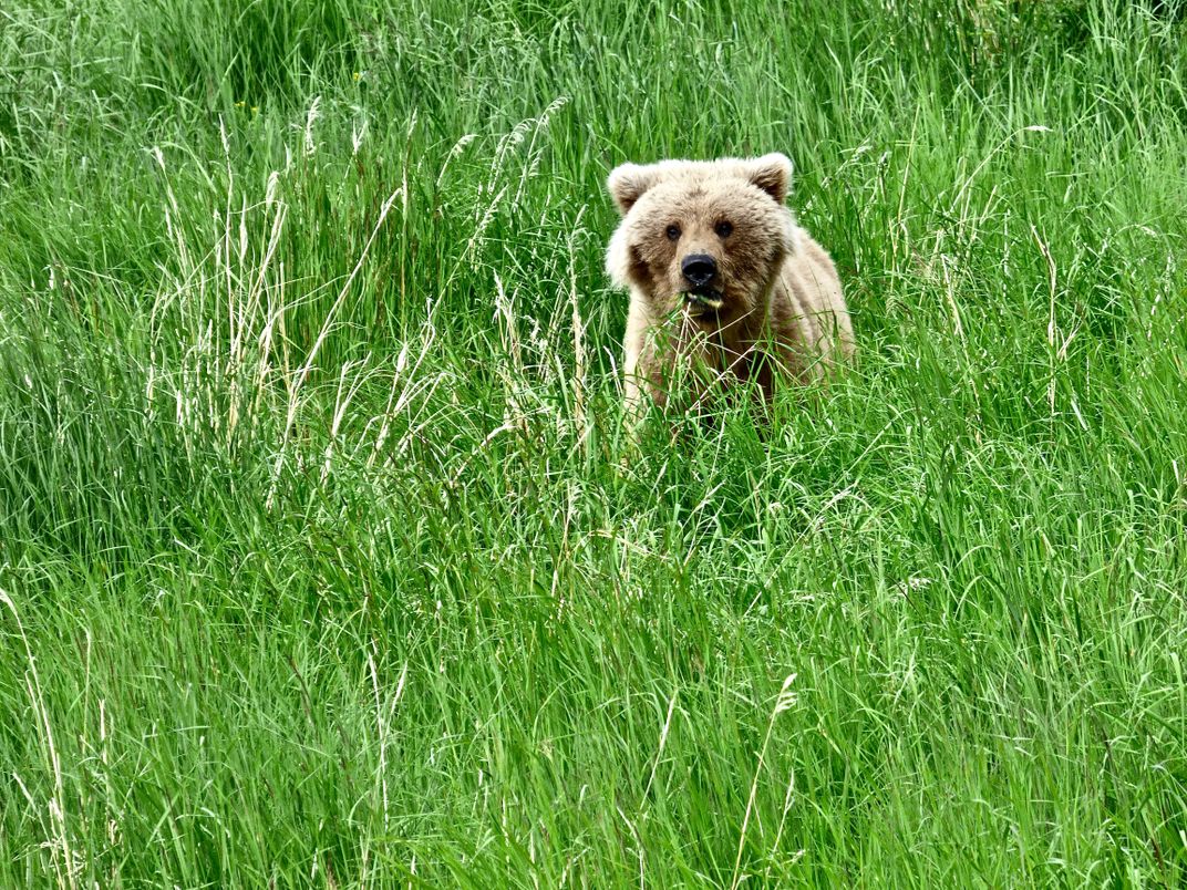 This fluffy little cub was bounding around in the tall grasses of Brooks Falls. The expected barrage of salmon did not arrive by June 30, 2021 so the mother bears and cubs spent time in the tall grass area nibbling away on grass. The tall grass nicely framed the little cub's head.