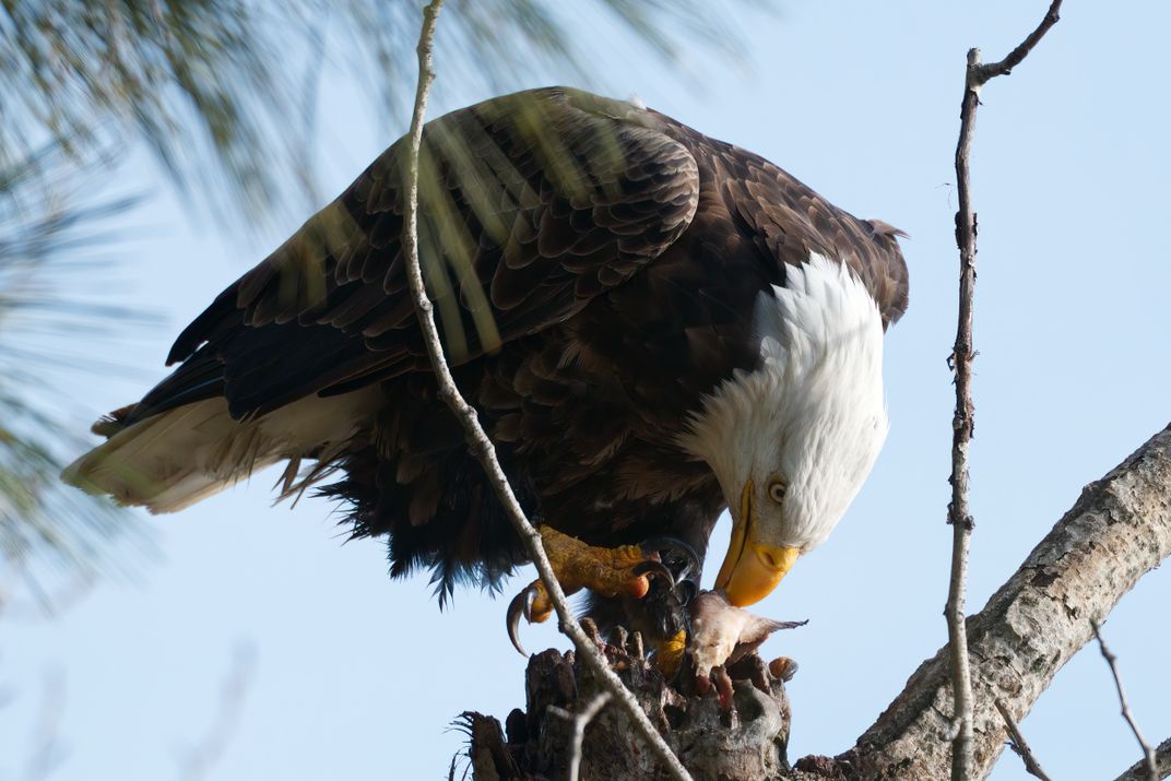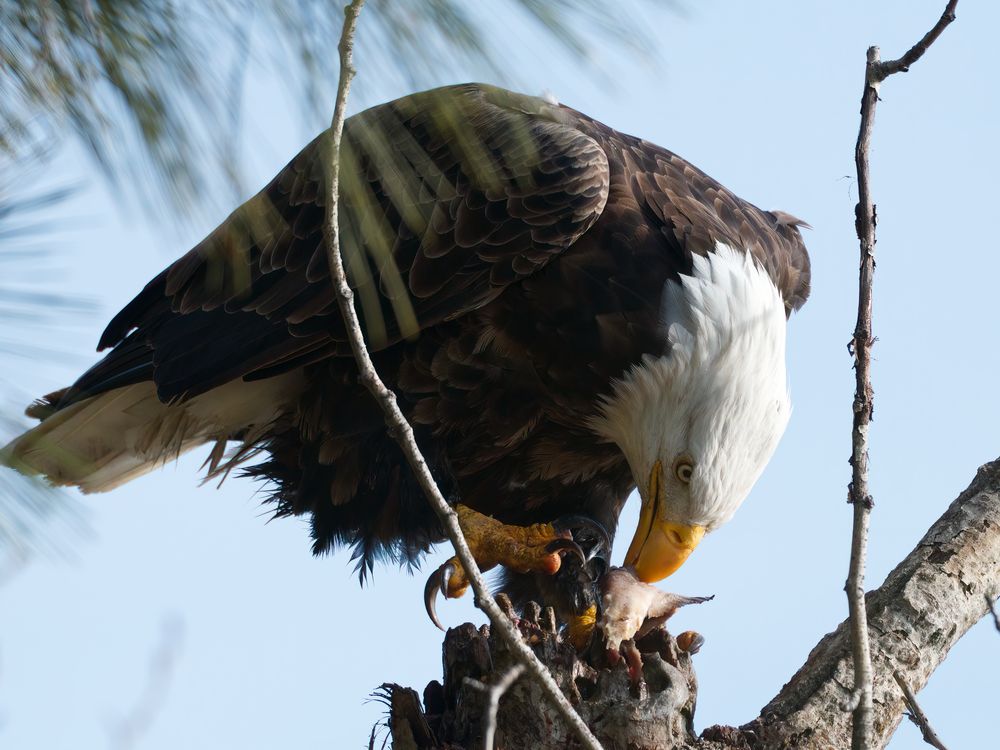 An adult bald eagle having caught a fresh salmon from Coeur d'Alene Lake, Idaho, is proceeding to eat his prize, using the surface of a broken off tree as a table. This allows him to utilize his talons as precision cutlery to cut and shred the fish.