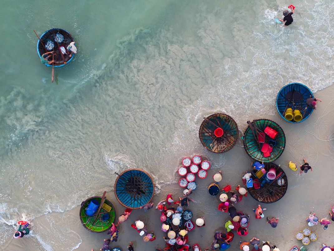 In May 2024 I went visit Hoi An , in central Vietnam. one morning I went to Tam Tien fish market situated on the beach in Nui Thanh district, the clusters of wooden fishing boats gather and drop anchor in the water. Teams of basket boats plow through the waves carrying last night's catch in barrels to the shore and sell them to the traders and locals on the beach.