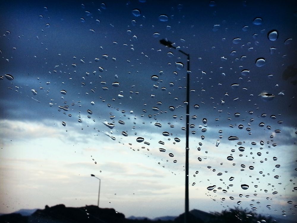 the shot is showing rain drops on car glass with beautiful view and color of the sky