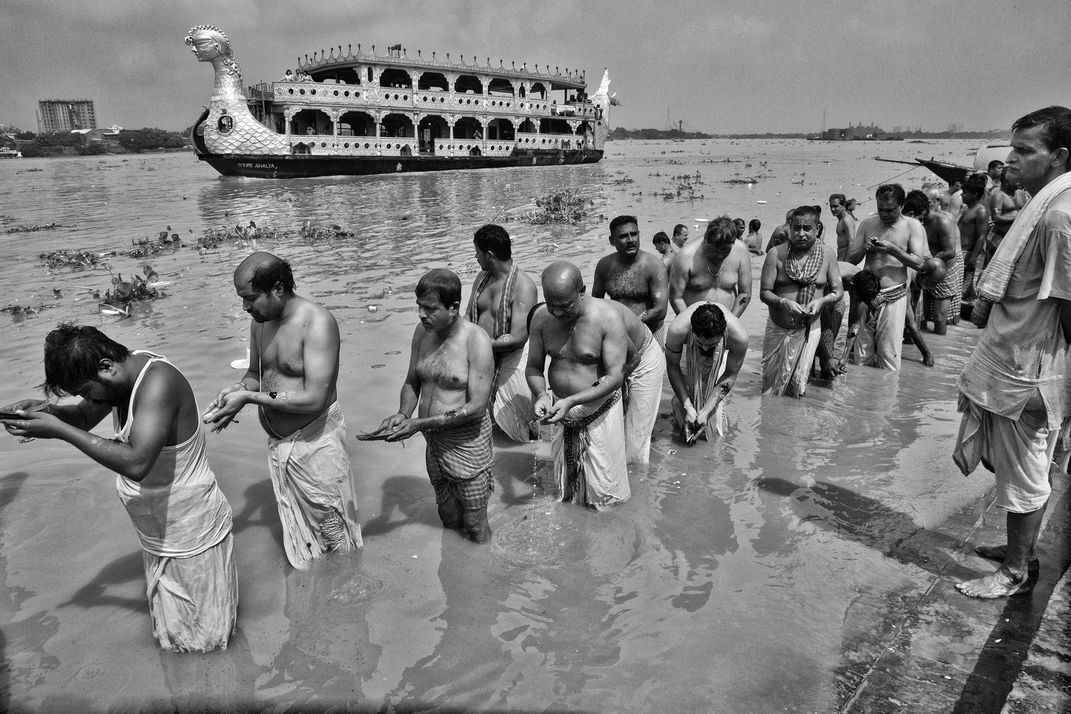 On the morning of Mahalaya, Hindus take a dip in the holy Ganges riverand performs Tarpan--the ritual to pay homage to and seek salvation for their ancestors.A decorated tourist boat is seen in the background.Kolkata, October 2021