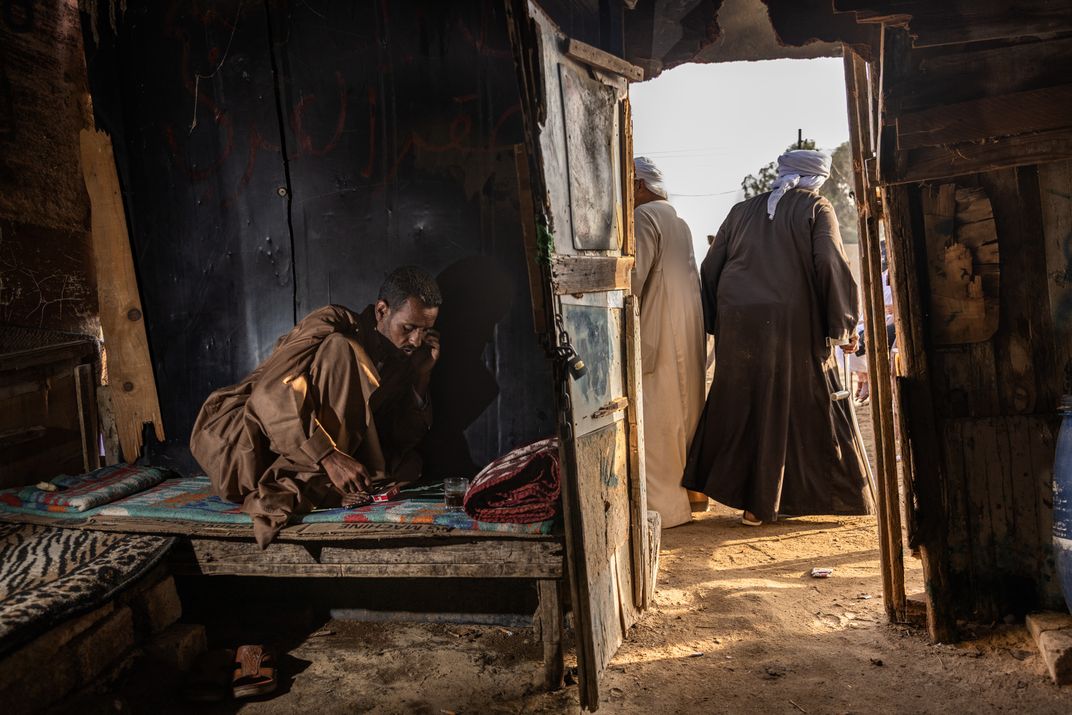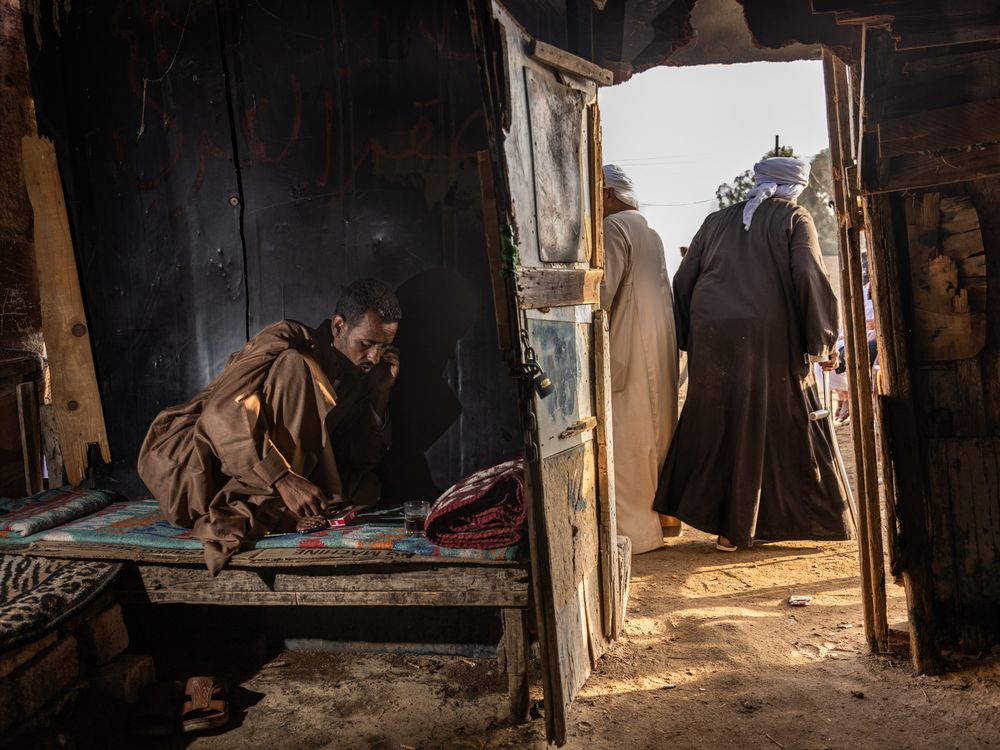 A man makes a phone call in a tea shack at Cairo’s Birqash camel market, one of the largest in the Middle East, Sept 19, 2025. During one of my many visits to the market, the owner invited me in for tea, where I witnessed this scene unfold.