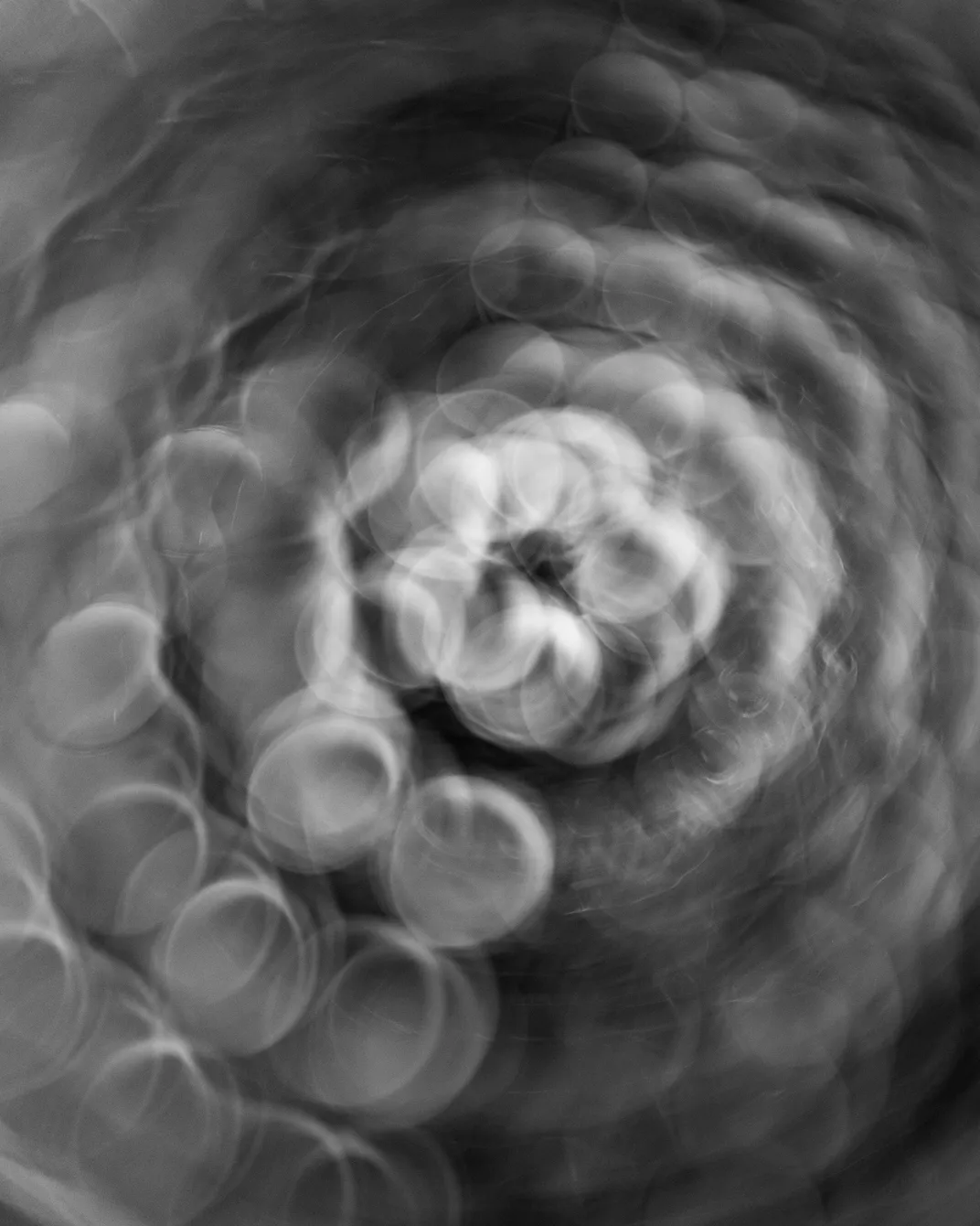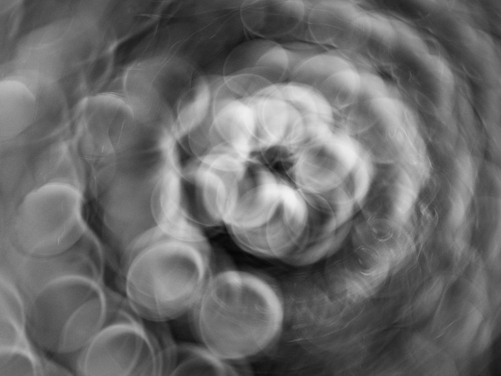 An abstract ICM photograph of teacups drying near a pottery kiln in Kona, Hawaii. Deliberate motion during a long exposure transforms the cups into spiraling circles of light and shadow, evoking the ethereal process of creation and the warmth of the kiln.