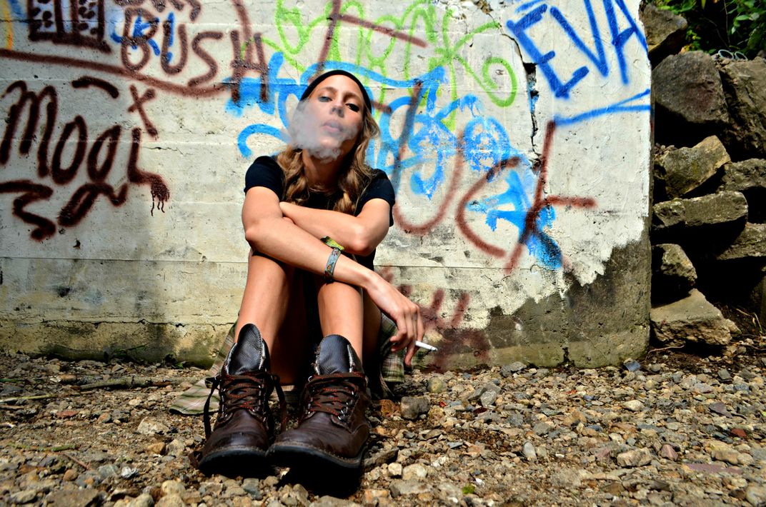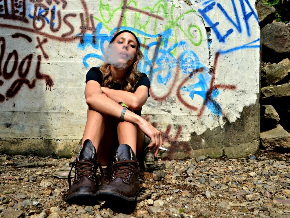 Teenage girl sits under a graffiti-ed bridge smoking