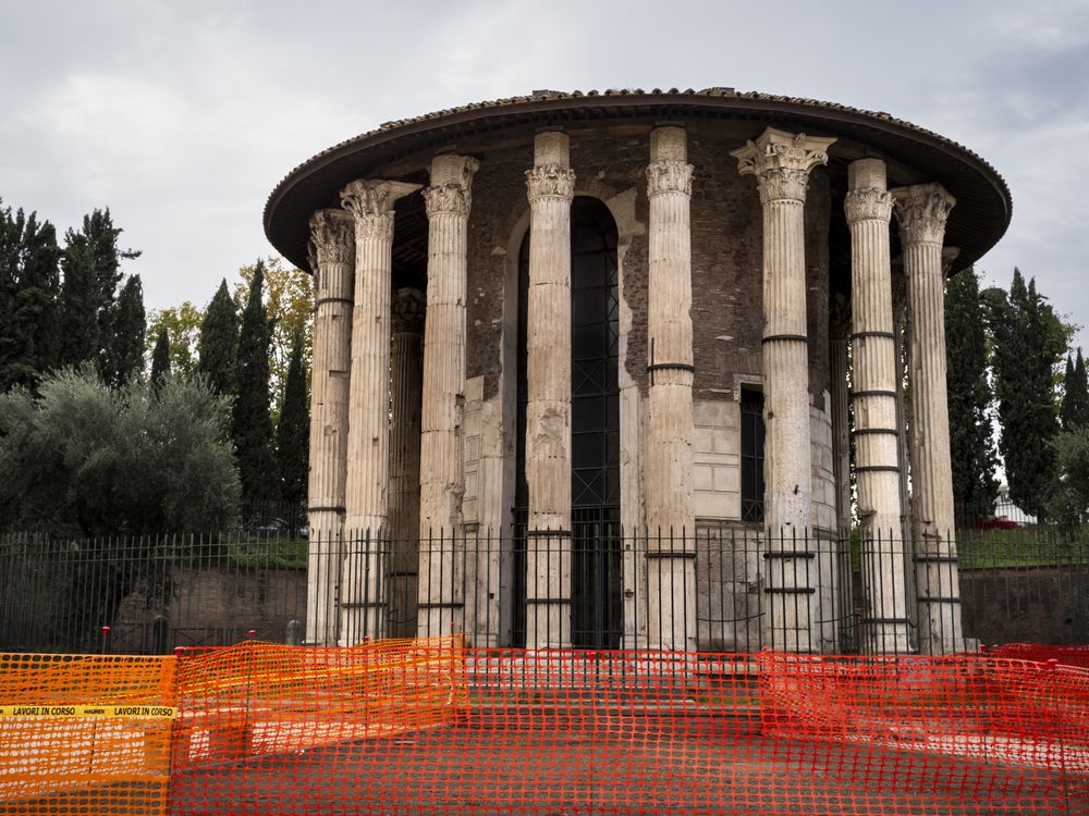 Rome's ancient Temple of Hercules Victor has been through many transformations serving over the years, among other things, as both a pagan temple and Christian church. The earliest surviving marble building in Rome, it dates from the mid-second century BC. Today the old structure continues to evolve, as evidenced by the colorful construction netting that has sprouted around its perimeter.In Rome I am always struck by the collision of the old and new. The city absorbs and thrives on the contrasts. At the ancient Temple of Hercules Victor, colorful orange plastic construction netting is challenging the old building's elegant classical lines. I was compelled to stop and make a shot of this moment in the temple's long history.