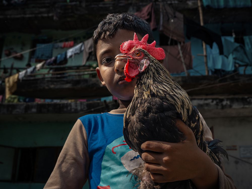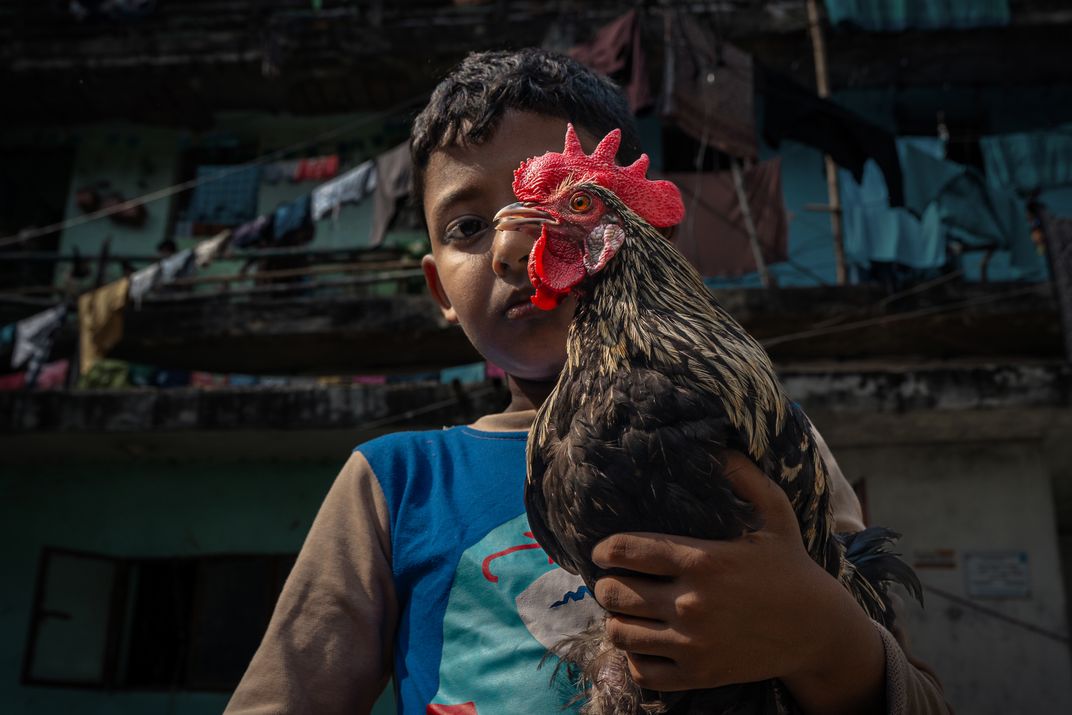 In the heart of a crowded alley, a boy cradles his rooster, their connection unfolding like a gentle rhythm. Amid laundry lines and concrete walls, their bond flows quietly—soft feathers brushing against the memory of childhood: no leash, no cage—only trust. The rooster’s red crown glows softly, a heartbeat steady in the boy’s embrace. In this fleeting moment, love needs no words- it is lived, held, and quietly pulses in the heart of pethood.
