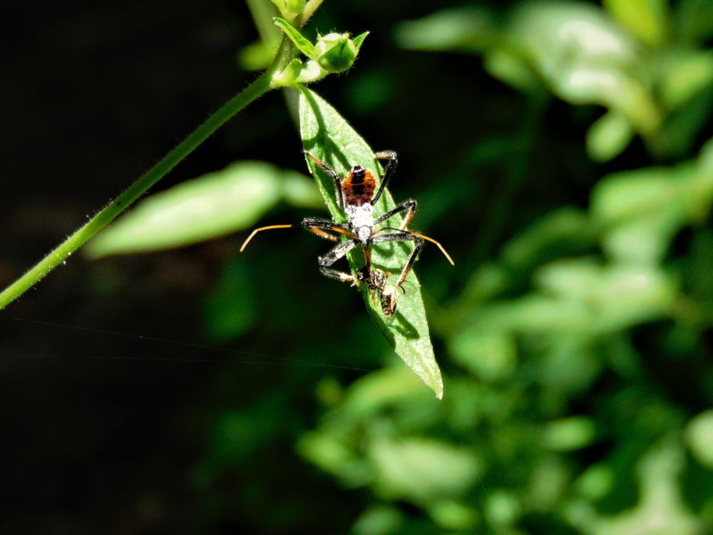 This photo was taken with my Sony Cyber Shot DSC H-300 camera. This photo is of a Assassin Bug - Microtomus purcis on our forestry property in Palmyra Tennessee. The photo was taken around 11:10, just before noon, the sun was up and pretty bright. I had to mildly adjust clarity and add a sunscreen filter from my computer to enhance the subjects within this photograph. This photograph is of the assassin bug catching its prey. There is a previous photo of the same subjects without edits, the assassin bug is feeding on the bee in that one.