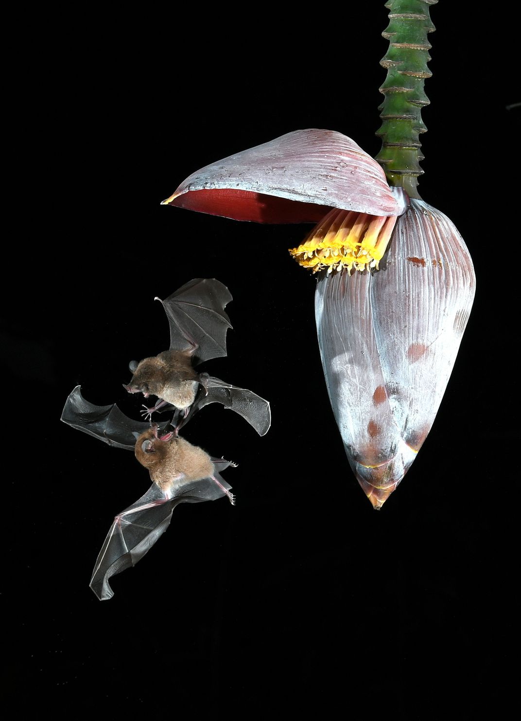 A duo of tent-making bats in Costa Rica duel over their access to night nectar - one of their favorite and sustaining foods.