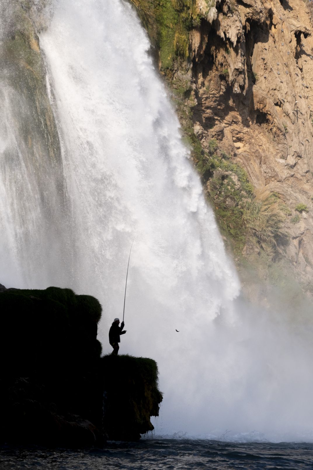 The moment when the fisherman caught his catch at Antalya's world-famous Düden Waterfall.Going down near the waterfall and fishing there is a dangerous and difficult task.But this man is fearless.Even the water sound of that waterfall is enough not to frighten people.Since the fish population is high where the water flows, fishing here is profitable.I also compared the rock under the man to a human head.Such an appearance may have occurred because the waterfall water decreased.