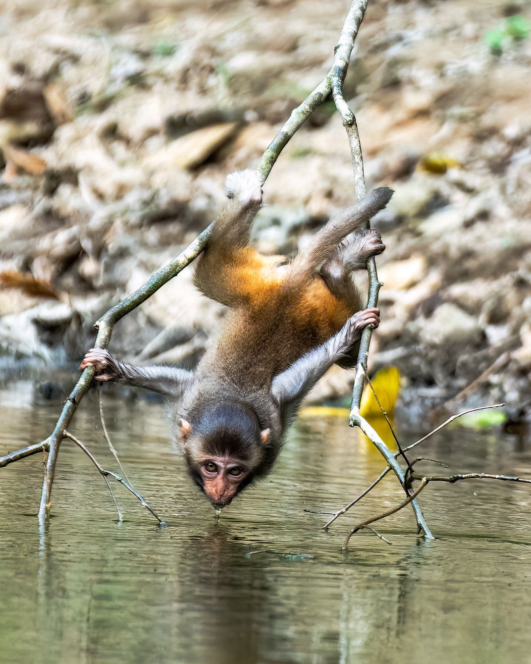 This photo is from a series of images of a Rhesus Macaque or Rhesus Monkey (Macaca mulatta) baby maneuvering its way down from a tree branch to a small pond in Satchari National Park, Habiganj District, Sylhet Division, Bangladesh to drink water. The Macaque would drink the water hanging from the tree upside down. After drinking it crawls back its way up in the trees. Still not adept yet, the baby is learning its acrobatic moves. During dry season many of the inhabitants of the forest including Rhesus Macaque, Northern Pig-tailed Macaque, Crab-eating Mongoose, Wild boar, Northern Red Muntjac and many bird species come to drink water in this small pond located just a few feet from the highway.