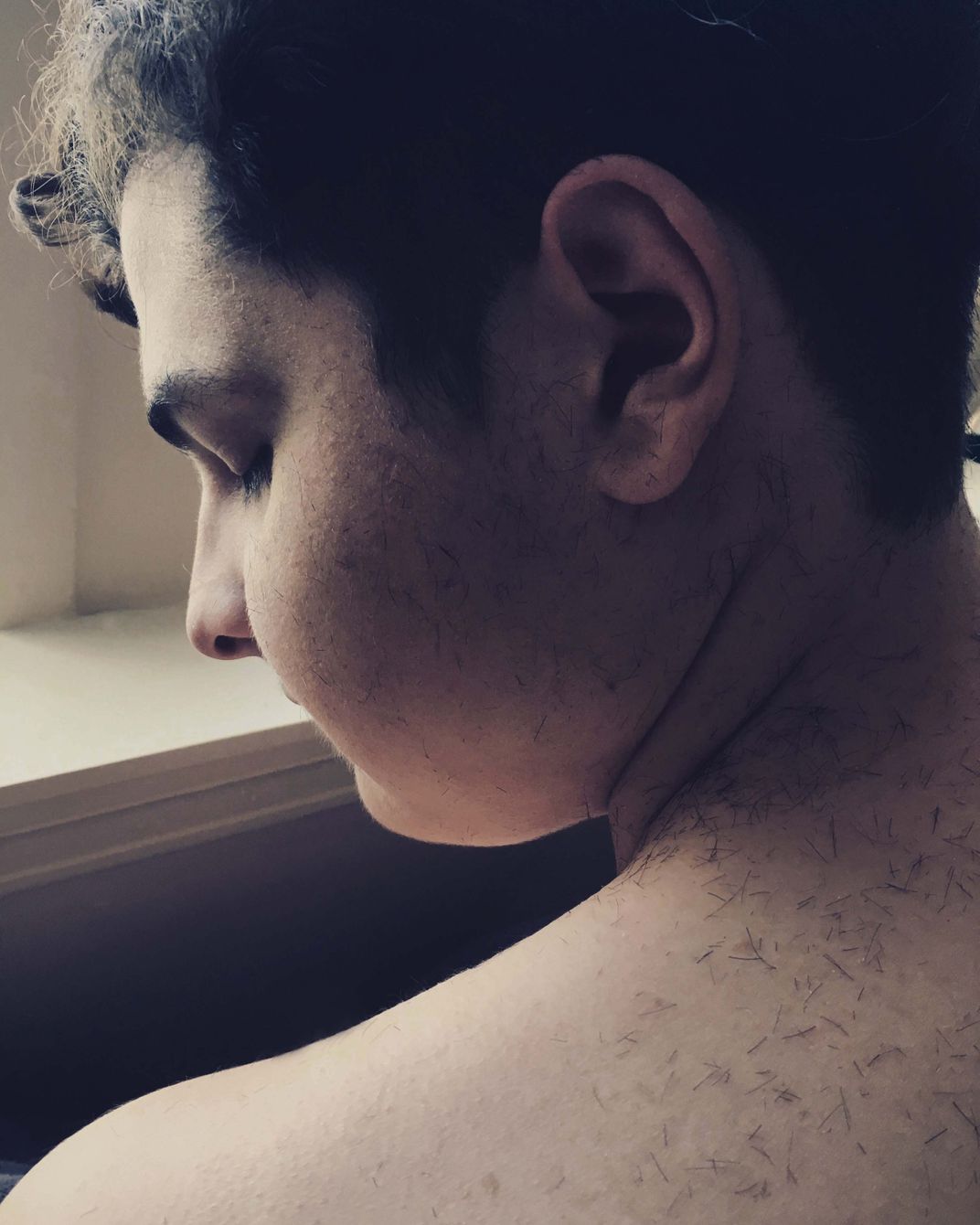I took this photograph in 2020 at the beginning of the pandemic. My son wanted to cut his hair. The simple act as cutting our son hair became a visual poem. My husband and my son sitting at the window in the soft afternoon light, his hair falling in slow motion on his shoulders restored a sense of time and space.