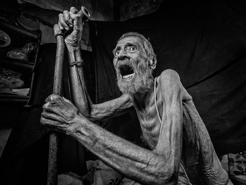 The Subject: An older man, visibly frail and severely underweight, with his ribcage and bones prominently showing. His face is contorted in a wide open-mouthed scream or expression of extreme agony and desperation. His eyes are wide and focused, adding to the intensity of the moment. The Stick/Crutch: He is gripping a wooden stick or crutch with both hands, using it to support himself or perhaps as a lifeline. His knuckles are white, suggesting immense physical effort and pain. The Setting: The background is dark, suggesting a dimly lit, possibly indoor or impoverished setting, with some indiscernible objects and fabric visible. The focus is entirely on the man's expression and struggle. The Tone: The photograph conveys a profound sense of suffering, vulnerability, and the harsh reality of aging, poverty, or illness.