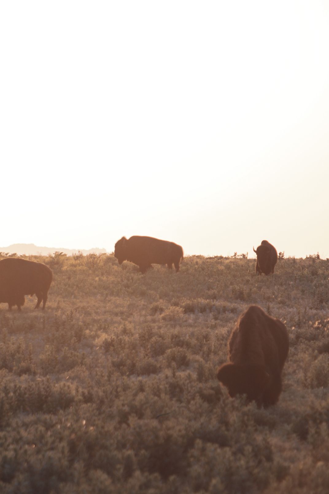 This photo was taken at the Wichita Mountains Wildlife Refuge in Oklahoma of bison roaming and grazing at sunset.