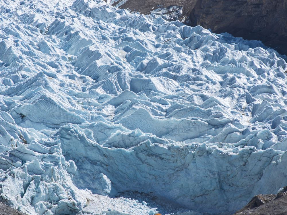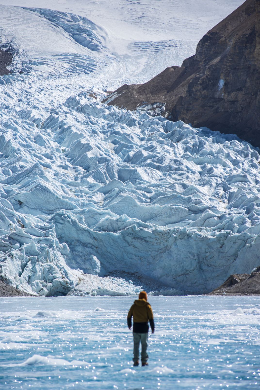 Shigatse Qudennima Glacier This photo shows the glaciers in Xizang, China. An explorer walks on the ice in winter