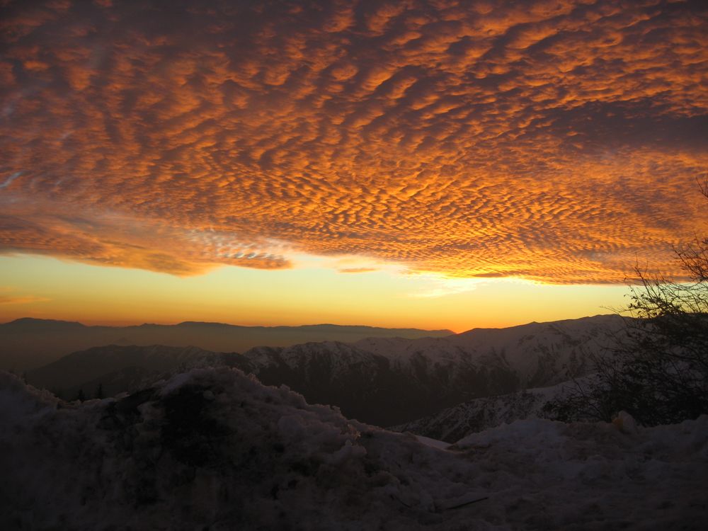 The Andes mountains in the clouds at sunset.