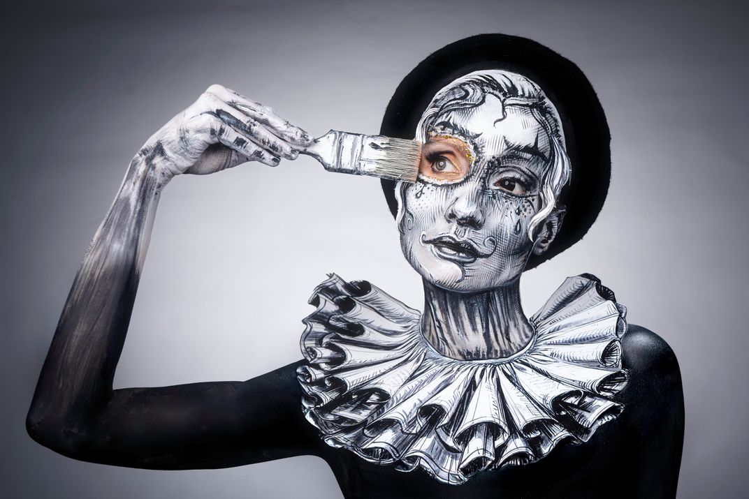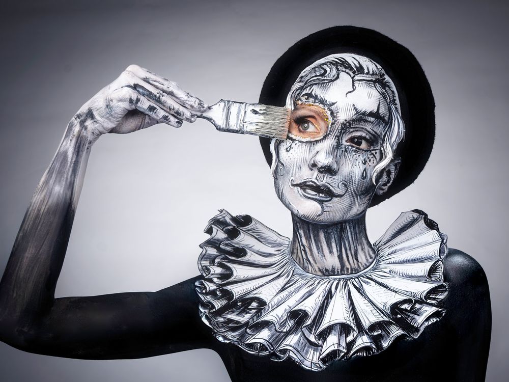 Created as a remote self-portrait, this work explores identity as a construct. Referencing Pierrot, the tragic figure of self-questioning, the painted surface becomes a space where mask, choice, and self-created reality merge into becoming.