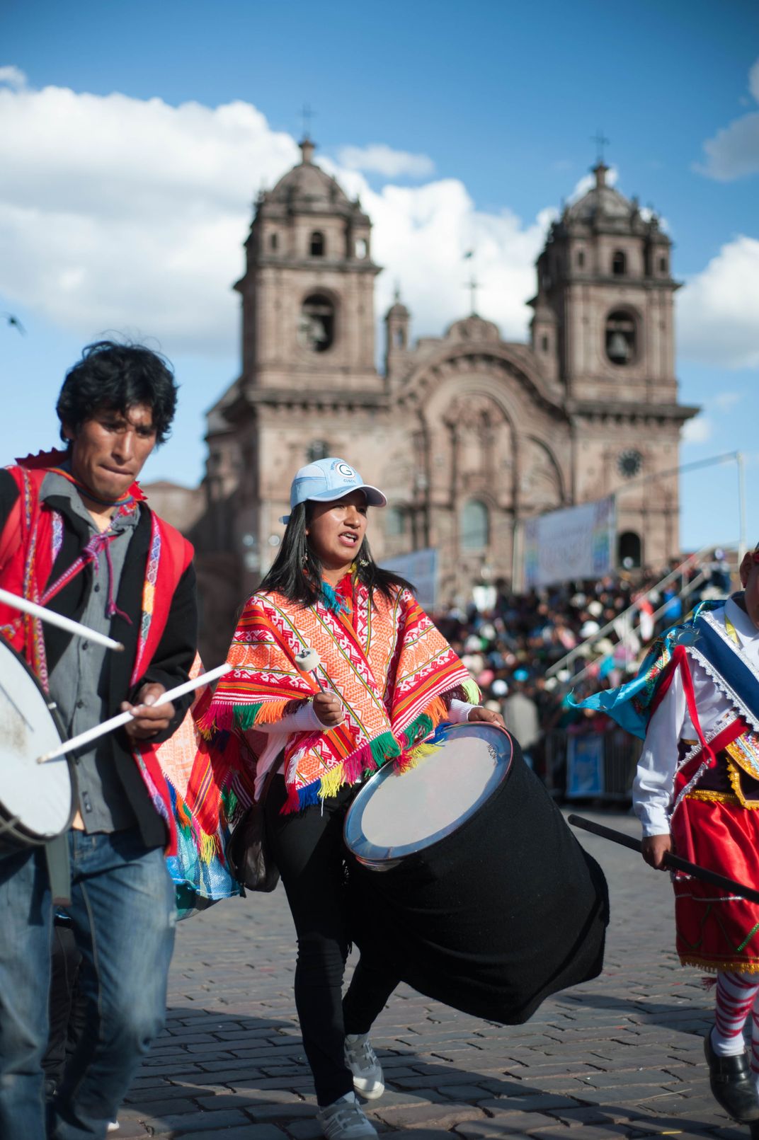They are part of one of the several parades in the Plaza Mayor of Cuzco during the June celebrations