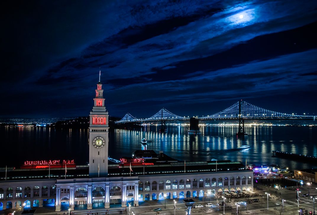 The Bay Lights and San Francisco Ferry Building under a rising full moon