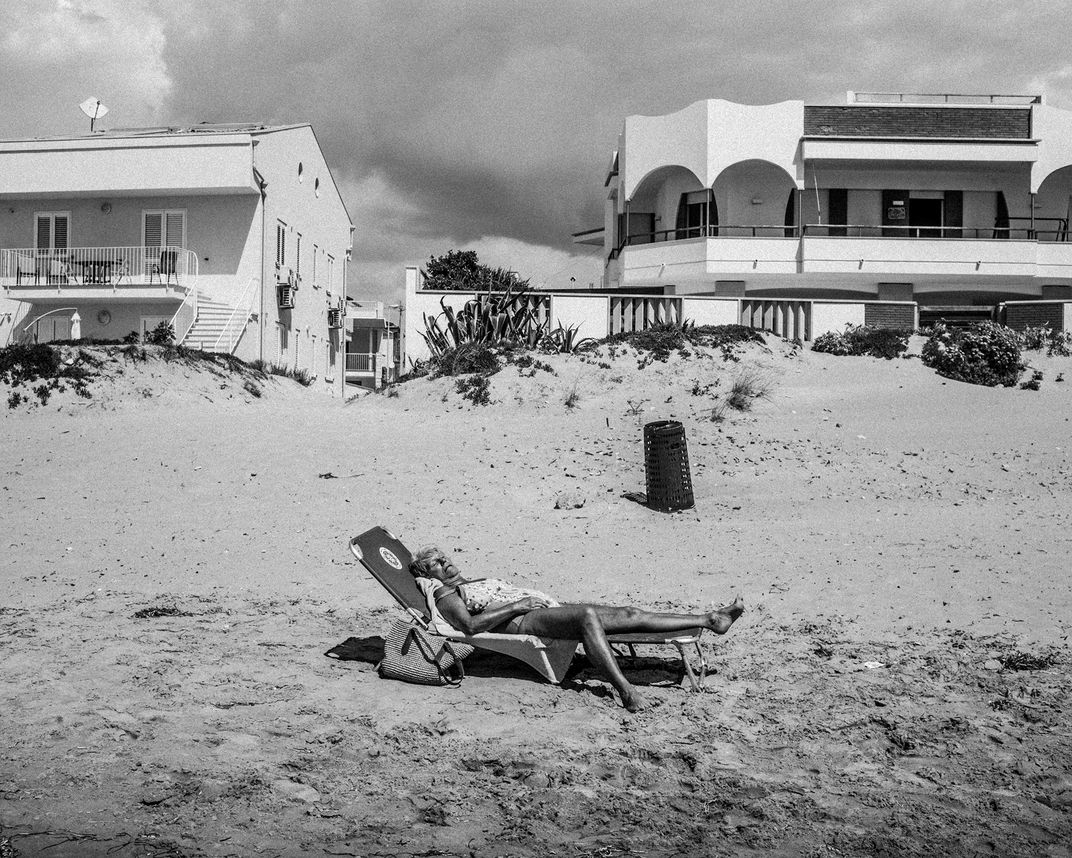 A woman takes sun on the beach in Punta Secca, Sicily.