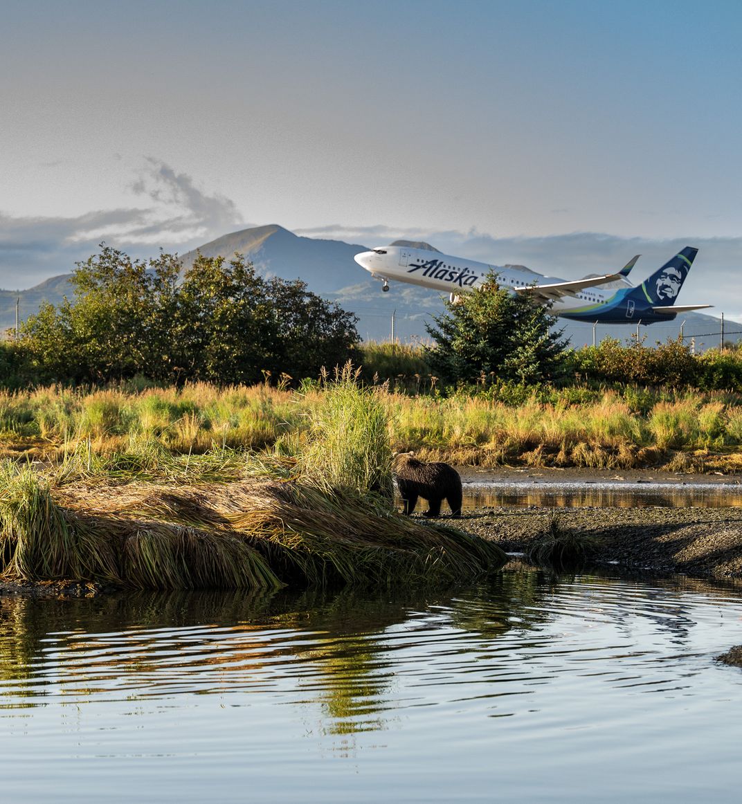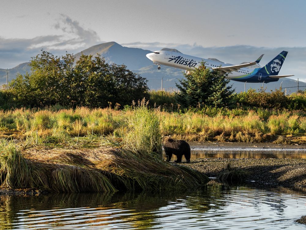 A Kodiak brown bear watches as an Alaska airline jet takes off. The bear stands at his favorite fishing spot at the Buskin River next to the Kodiak airport.