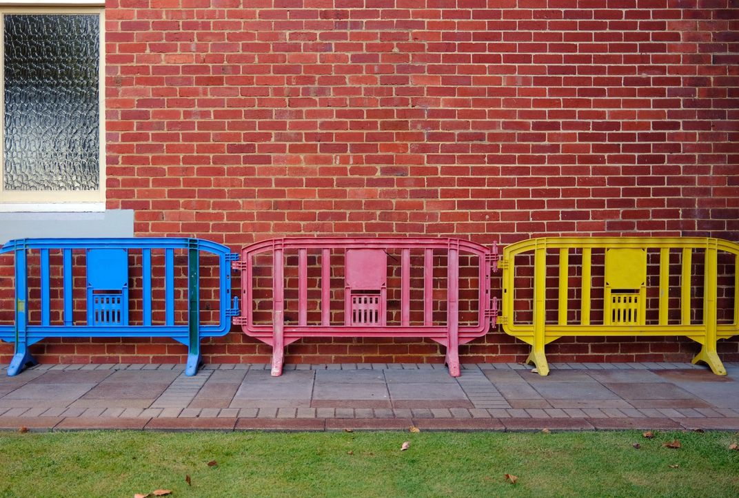 This photograph shows three brightly colored crowd-control barriers — blue, pink, and yellow — lined neatly against a red-brick wall beneath a frosted window. Normally associated with restriction, here the barriers take on an almost playful quality, transformed into a composition of geometry and color.