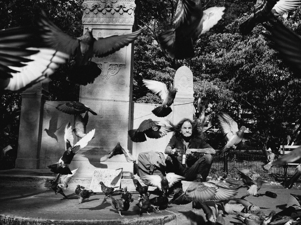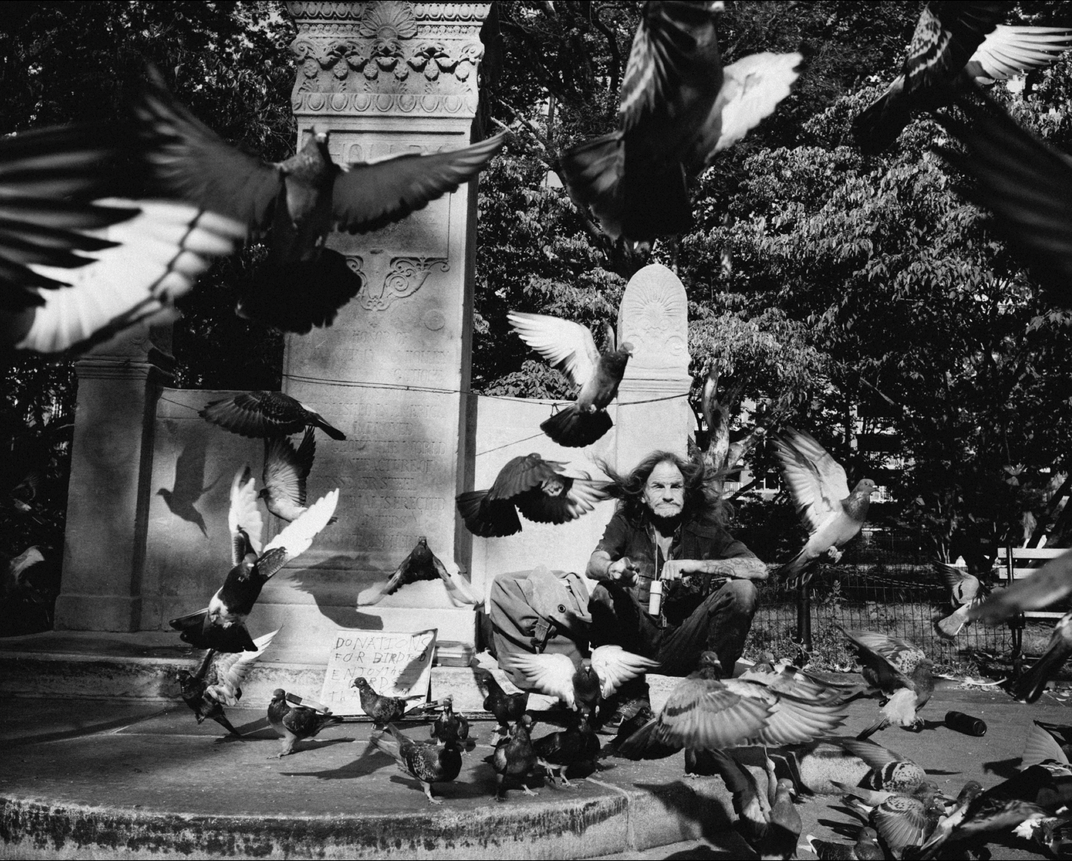 Washington Square Park's Larry "The Birdman" demonstrates his ability to summon a flock of pigeons to his feet and then send them off flying into the air.