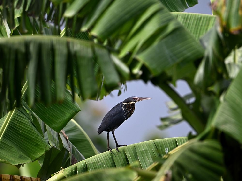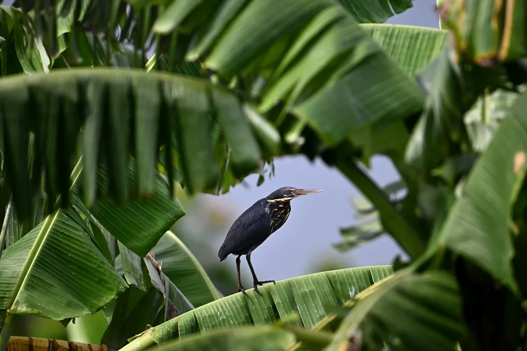 A Black Bittern stands poised on a banana leaf, its dark plumage glowing in the soft light. Hidden among the broad green leaves, it watches the world in silence, waiting for the perfect moment to move—an elegant shadow in the heart of nature.