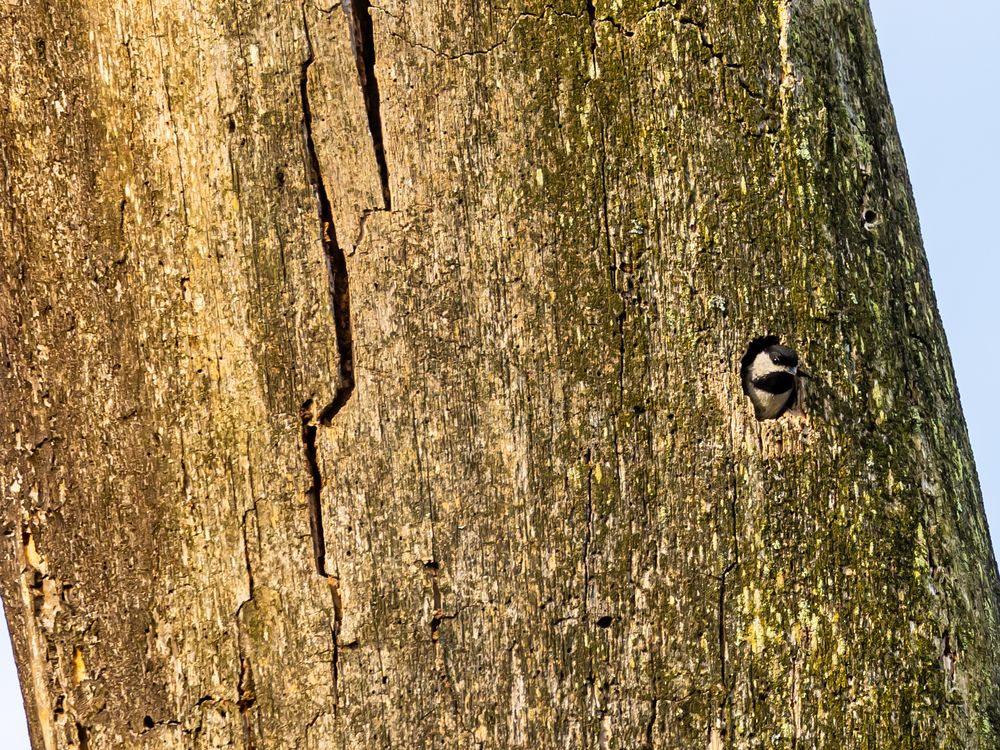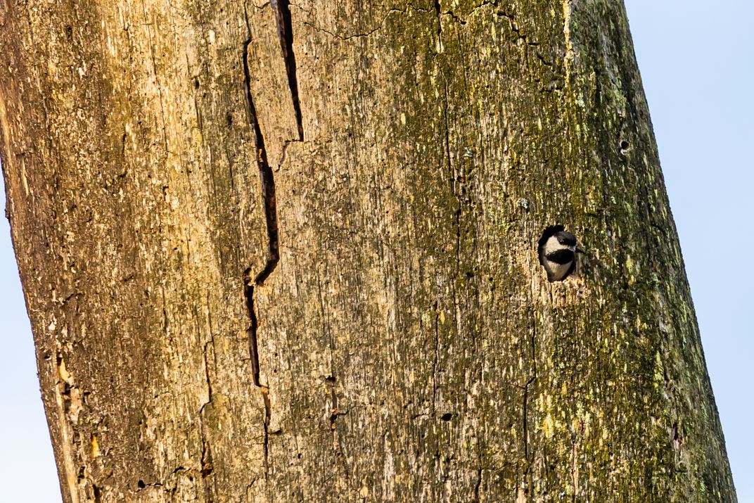 The black-capped chickadee checked outside before darting out of the nest hole inside the standing dead tree.