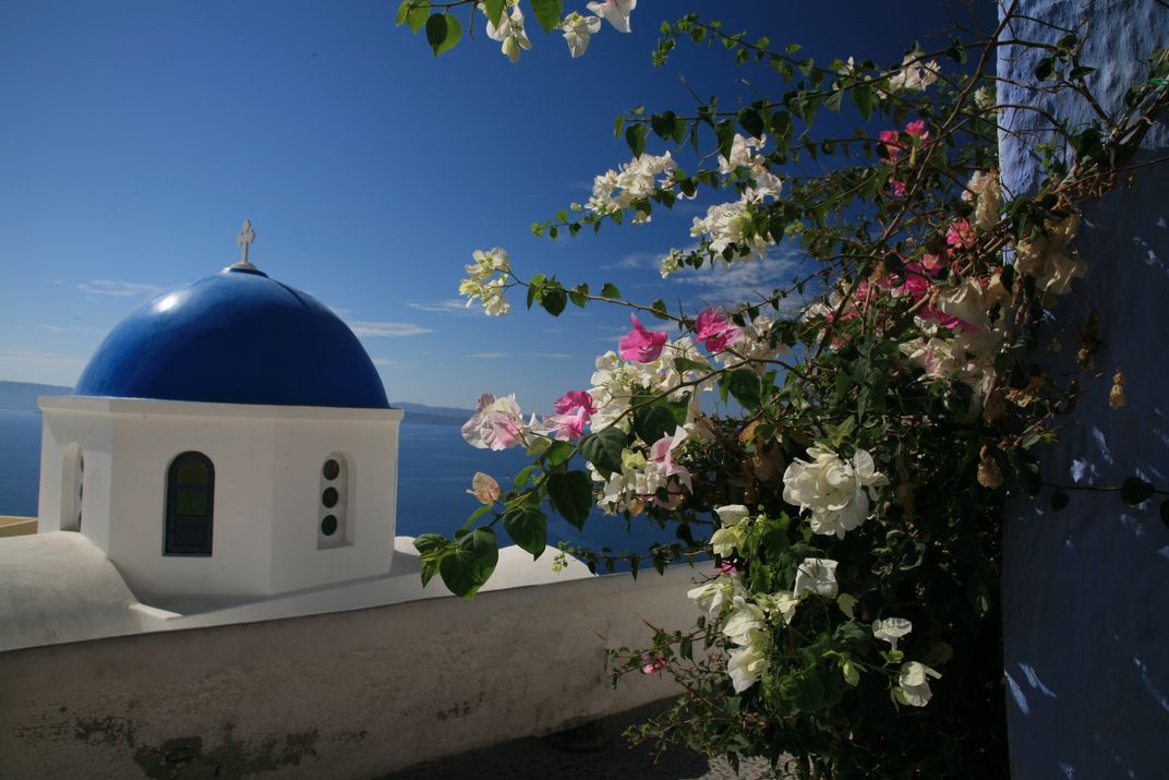 The Blue Domes of Oia Santorini. The Blue domes, Deep blue sea and colorful flowers, all contributed to the wonderful view.
