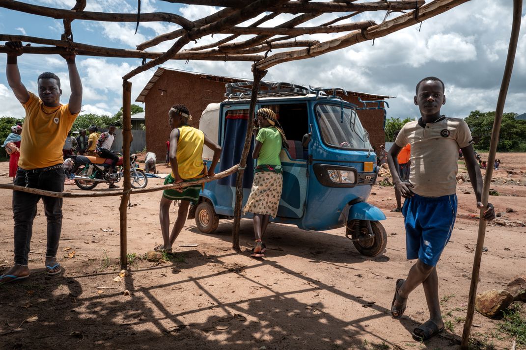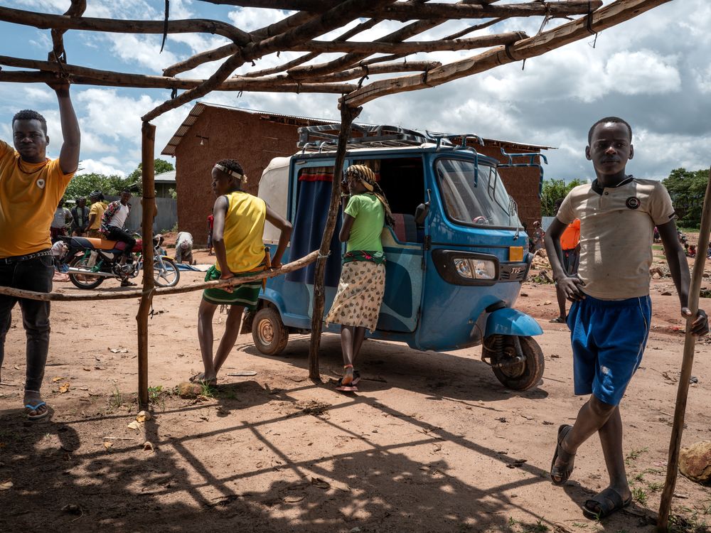 Young locals gather around a blue tuk-tuk in a dusty village square. The rhythm of colors — yellow, blue, and earth — mirrors the vibrant pulse of rural Ethiopian life.