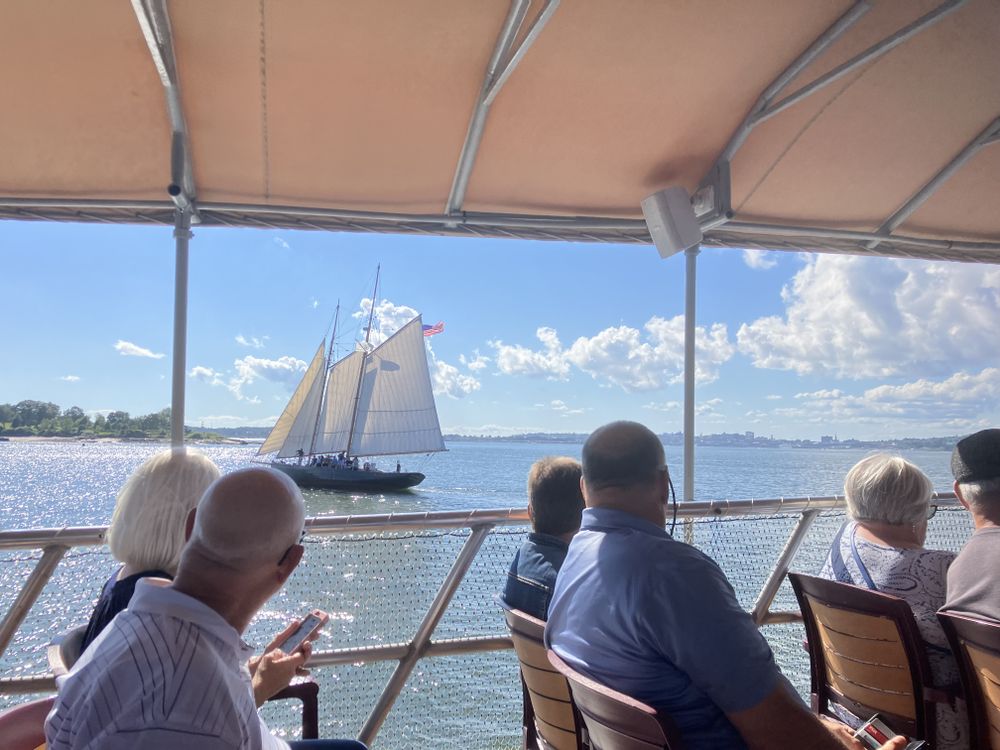 While visiting Portland, Maine, I traveled on a boat. We saw another boat in the distance. It was quite a different type of boat. I believe we managed to travel slightly faster than the other boat. An American flag flies in the distance, reminding us of the history of our country, and our innovation and industrialization.