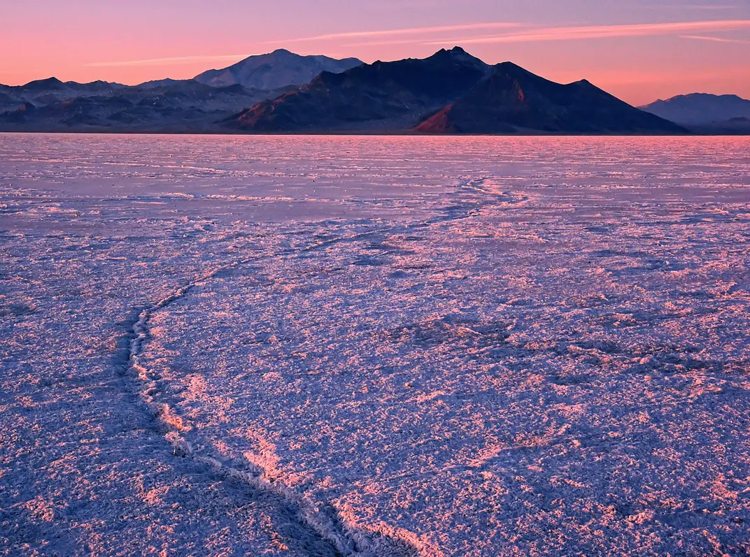 The Bonneville Salt Flats, near Wendover, UT are illuminated purple by late December sunset.