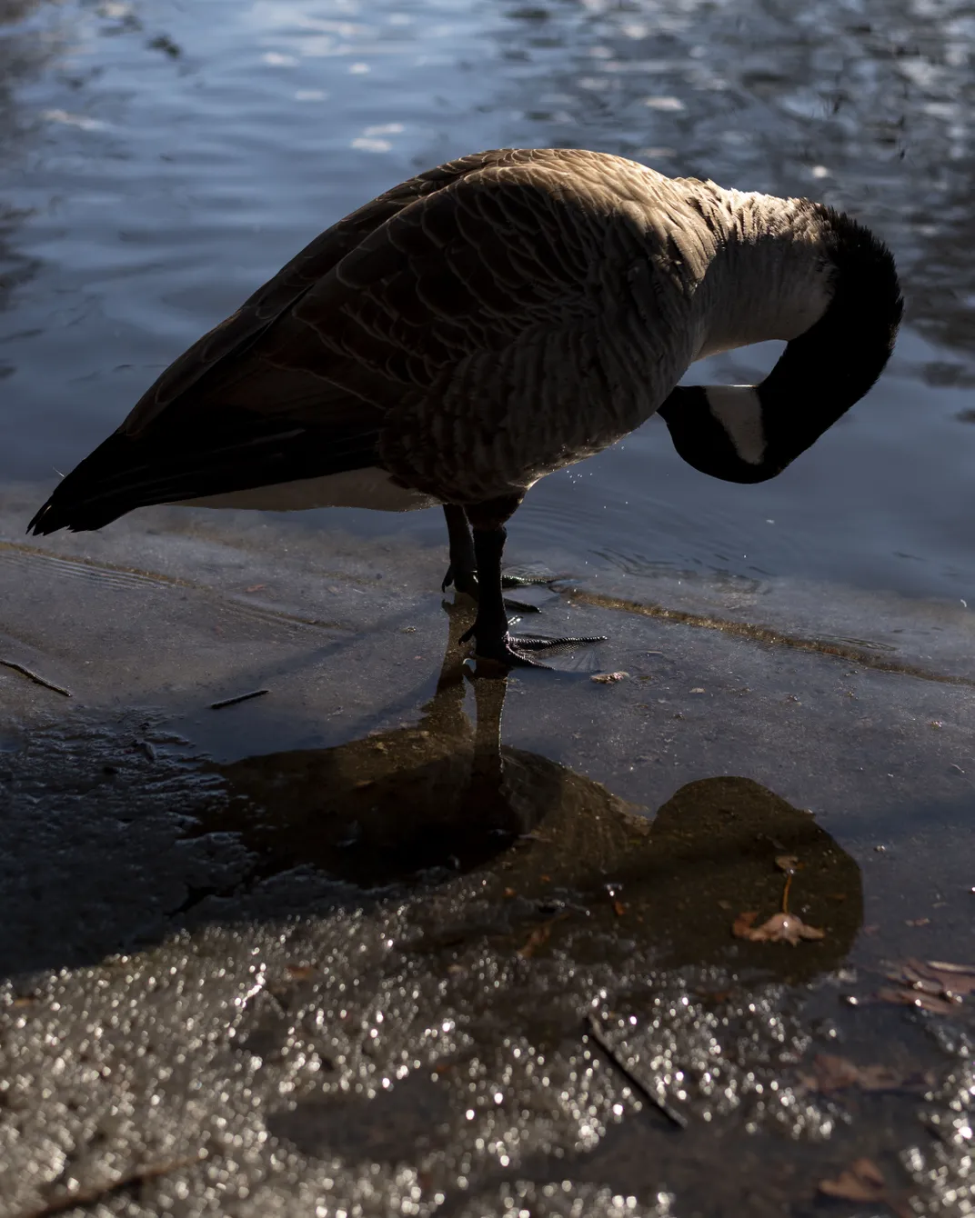Canada Goose stands in the water of the Charles River and tends to its chest.
