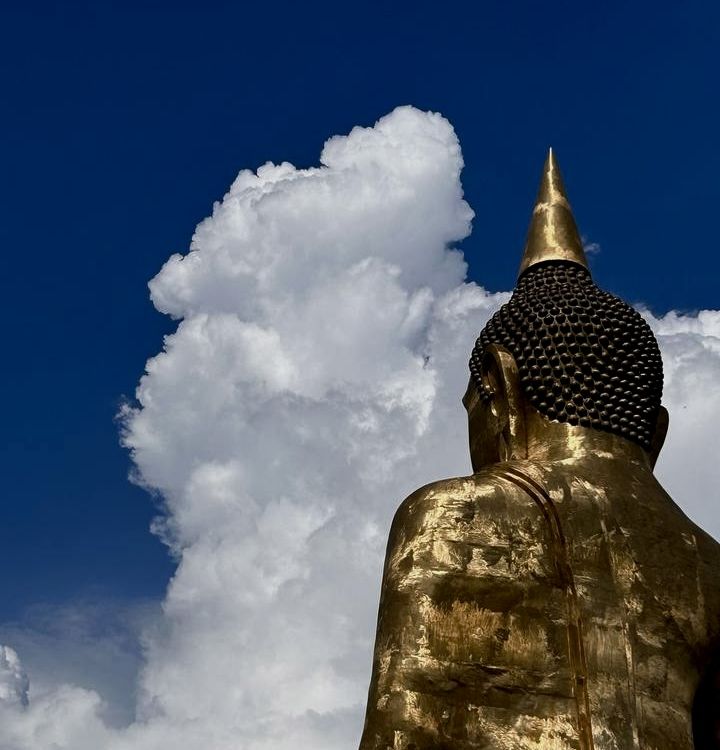 The photo was taken after walking on a pedestrian glass bridge in the mountains in Pattaya, Thailand.The photo shows a statue of Buddha against the sky.