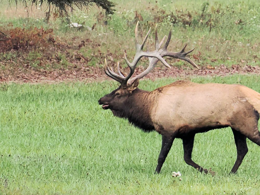 The Bull Elk usually bugles from inside the forest, then the Alpha Cow will enter the fields leading the rest of the herd. The Bull follows last to make sure that all of his Cows are headed in the right direction and not straying off to a rival Bull.