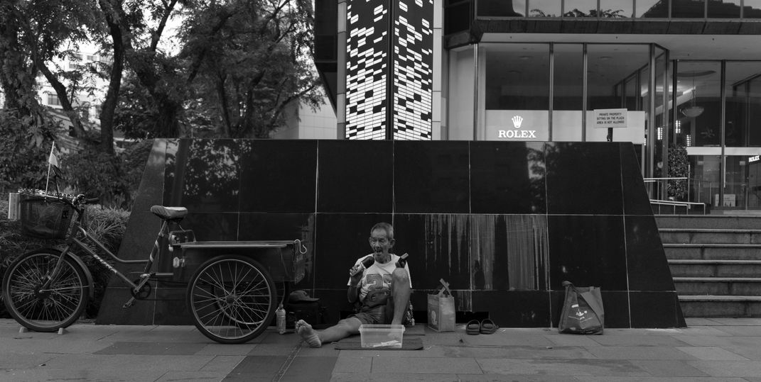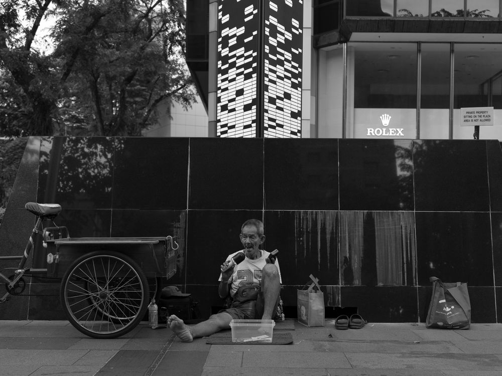 The Busker Grandpa was unable to read the English Sign. He is always busking daily in front of this luxury watches store. Even though he was forbidden to sit in front of the store, the store's staff was kind enough not to chase him away.