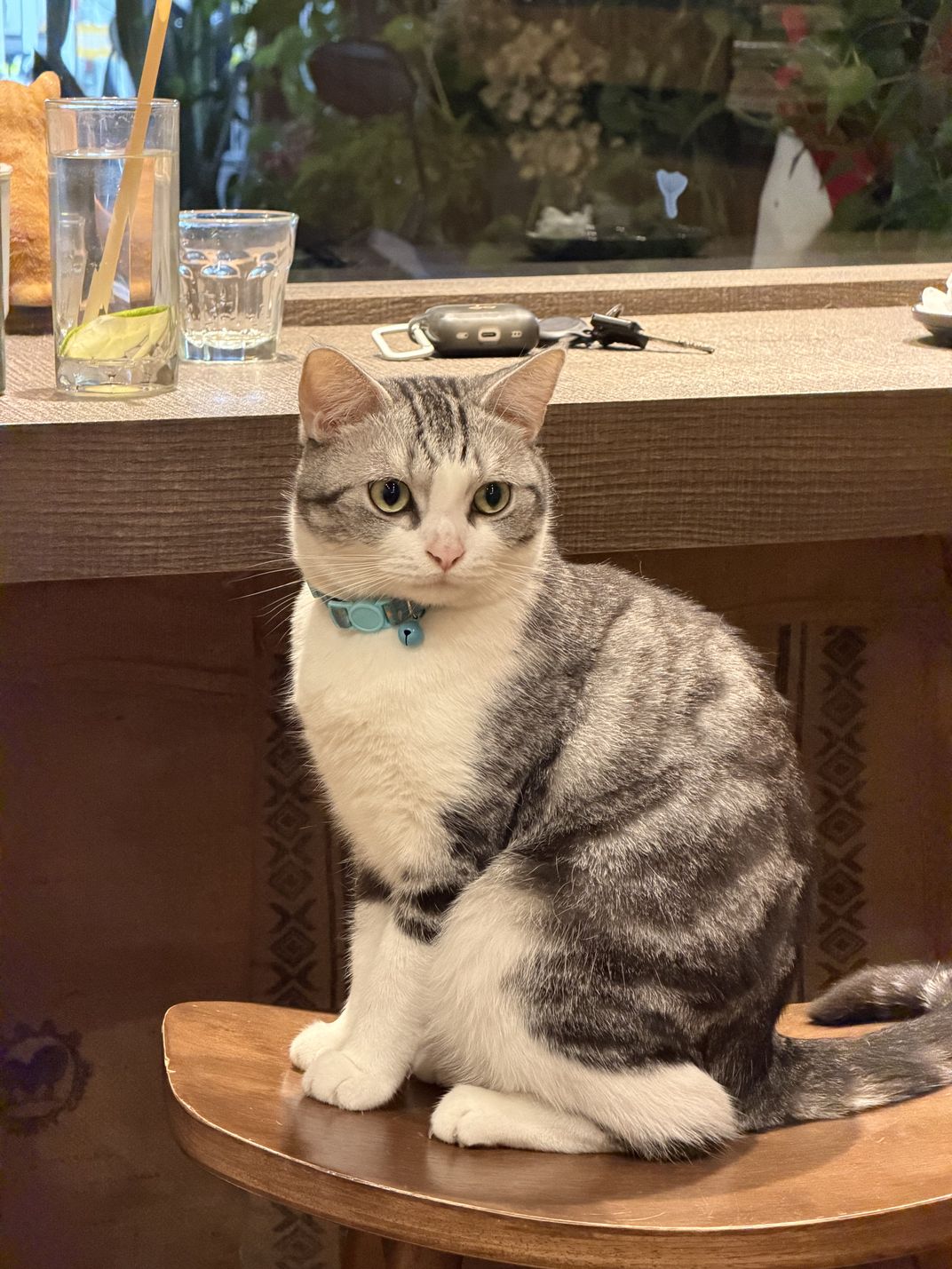 A well-behaved tabby cat sits politely on a barstool at a local cafe, seemingly guarding the keys and water glass on the counter while watching the customers.