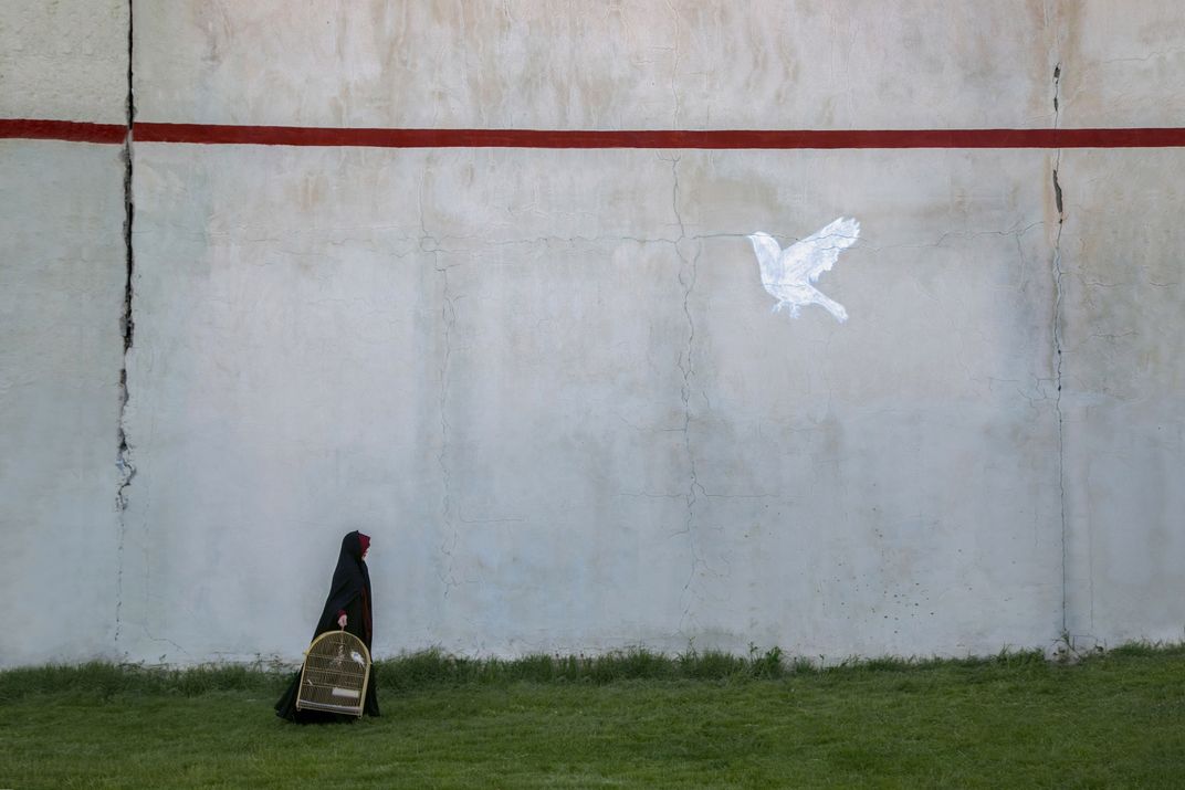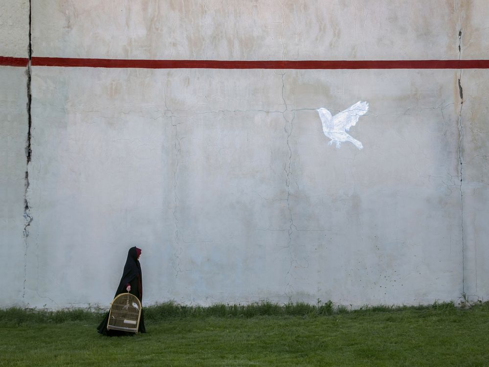 A woman wearing a veil and holding a cage with a bird in it is walking past a wall with a bird painted on it and a red line painted on the wall and above the bird. The bird on the wall, the red line, and the cage in the woman's hand are both associations of prohibition and captivity, and in addition to the woman's clothing, which is the hijab, it is absolutely mandatory for women to wear it due to the hijab law in Iran.