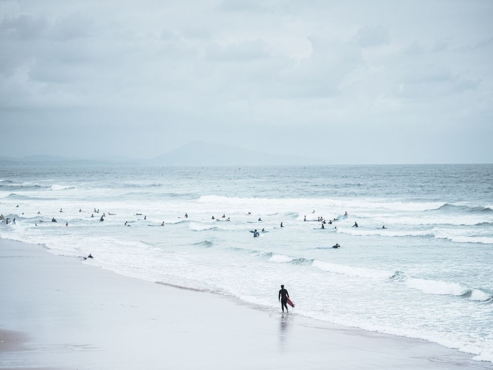 "A morning in Biarritz, France, where surfing has become a ritual. As often along the Basque coast, Spanish hills appear faintly in the distance. Surfers are everywhere. One stands apart, moving towards the waves. A brief pause, a moment of alignment with the ocean."