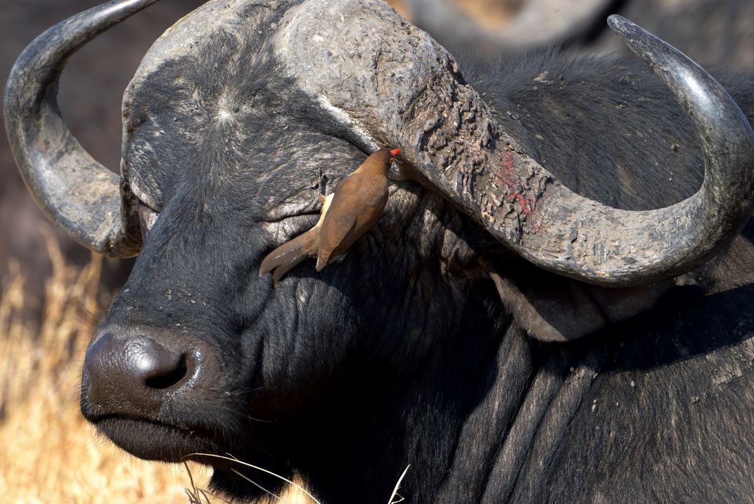 The Cape buffalo herd was resting around the waterhole, and I noticed this big male buffalo closing his eyes because of the Red-billed oxpecker activity. I wanted to save this moment how the strong and dangerous male Cape buffalo showed his weakness because of the noisy Red-billed oxpecker activity.