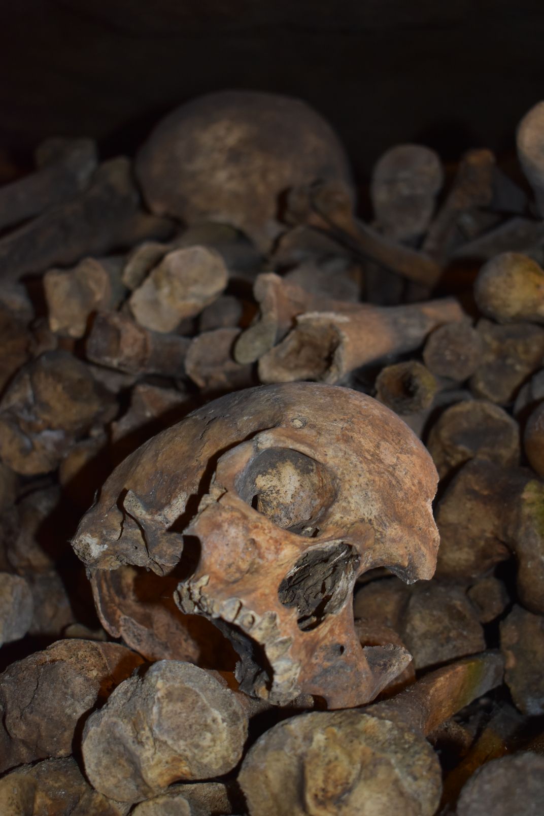 This photo was taken at the catacombs in the underground ossuaries below the city of Paris. The photo shows one of the many skulls and bones that were placed there to remain for centuries. This shows that they were all living people once in which they had their own lives.