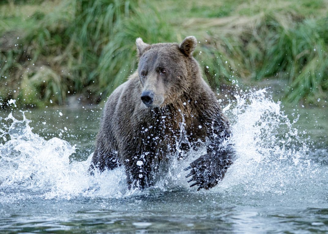 A sow chases a salmon upstream, right towards us, in Kuliak Bay.