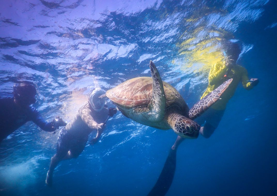 Snorkeling guides chasing a turtle in Moalboal, Philippines