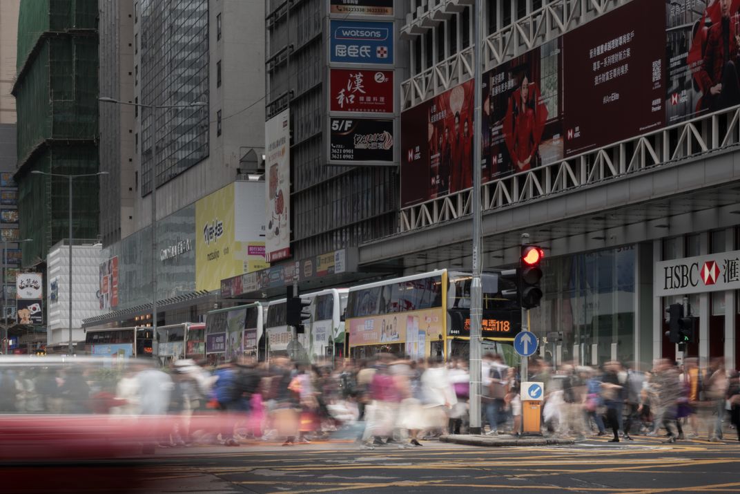 this is city of hong kong, the city that seems never to stop. the picture captures a street scene with moving pedestrians and vehicle, including quintessential hong kong visual elements such as its taxis in blur.