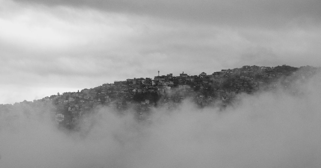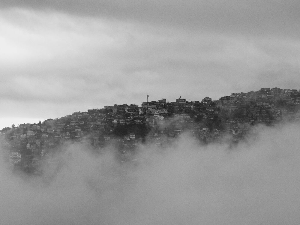 Houses sitting on mountains peer through a foggy afternoon in Baguio City.