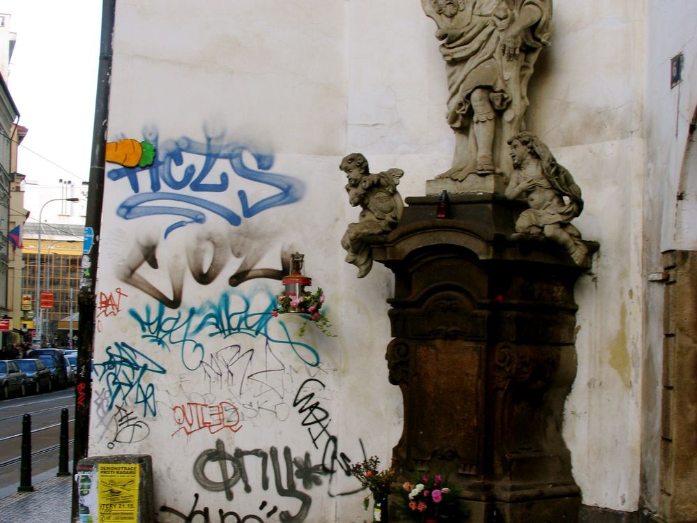 The clash of time - graffiti on a wall near an old statue of a Saint in Prague
