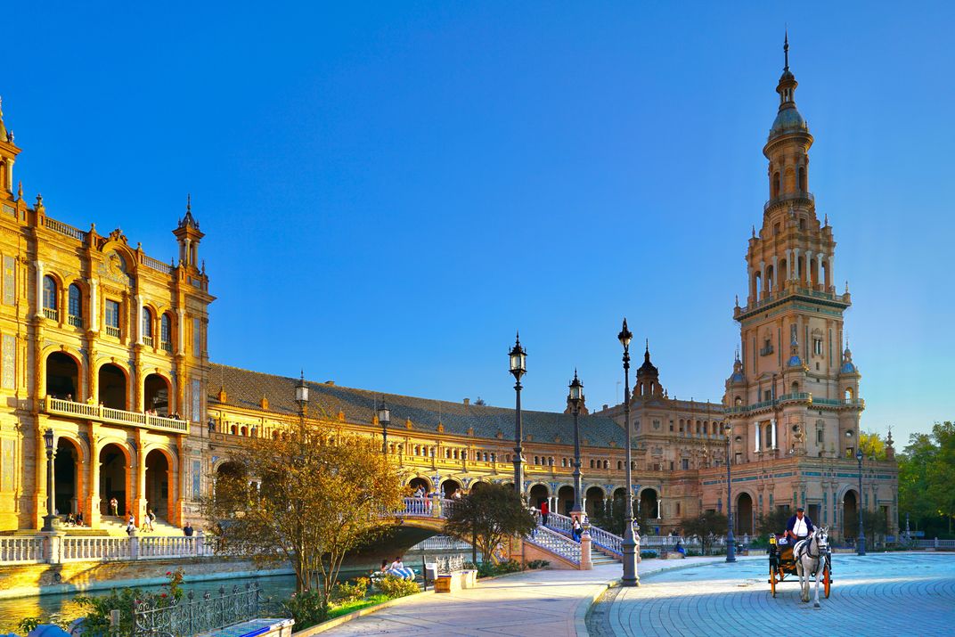 In the Spanish Square in Seville, the coachman drove this carriage through a square, forming a beautiful picture.