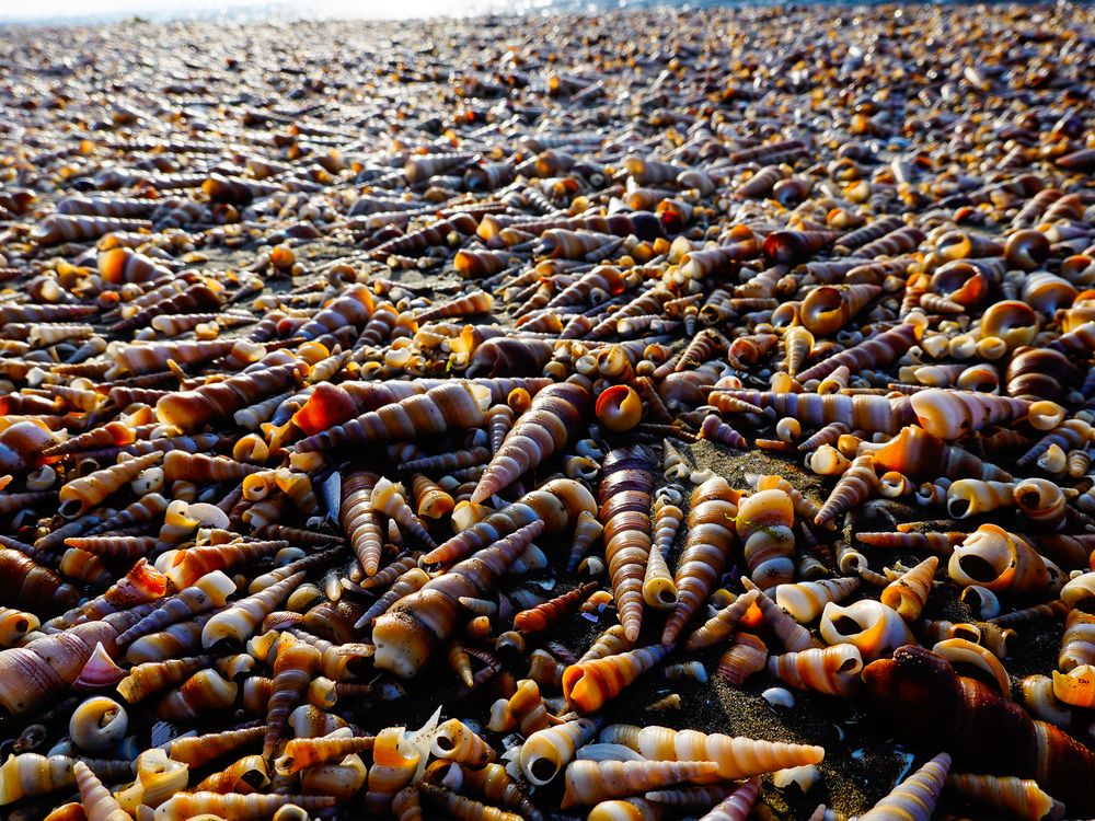 During the monsoon season (from September to March, annual year), the coast of Con Chay Muoi, District Binh Dai, Ben Tre province, Viet Nam is covered with millions of turritella shells.. These turritella are 7-8cm long, after a journey at sea, drift to the sun and die, their bodies spread along the 7km coastline of Thoi Thuan commune. When dawn comes, the turritella shells shine bright like glass. The local government has not yet put them into tourism because they want to preserve and protect the strange natural landscape that has appeared here for the past few decades