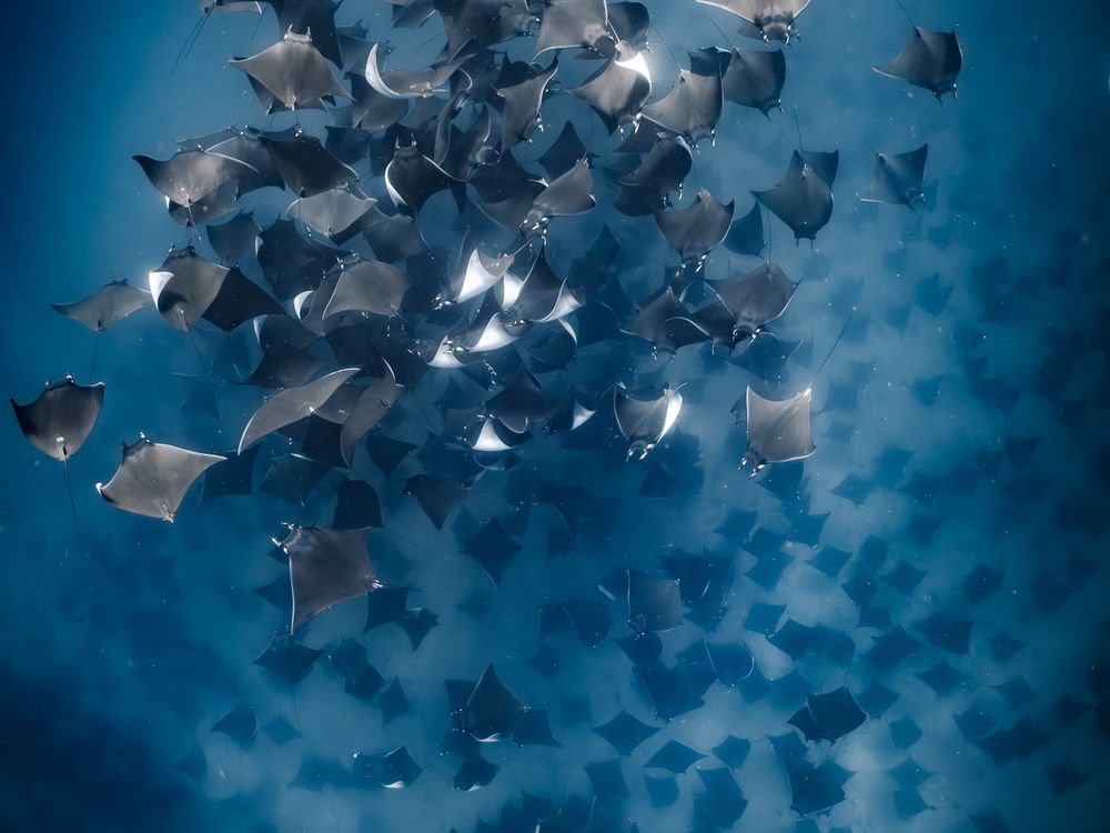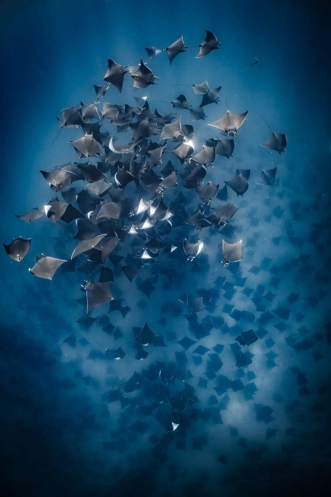 In late spring, the waters around Baja California Sur are teeming with mobulas. Known as “fevers”, these groups of rays are often gathered by the thousands. Feeding vortexes can be seen semi-regularly, but it’s much more rare to witness a mating vortex. On this day, endless rays glided in circles from ocean floor to surface, swooping in and out of the vortex as they paired off. The ultimate form of speed dating.
